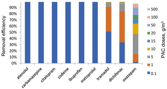 A literature review showed that these nine pharmaceuticals have been observed worldwide in wastewater effluents. The range is large, from 1 to 7043 ng/L, where the concentrations of the individual pharmaceuticals varied between 65–3494, 13–4609, 1–189, 10–1502, 209–4200, 6–660, 87–1603, 60–7043 and 5–1766 ng/L, for atenolol, carbamazepine, citalopram, codeine, ibuprofen, metoprolol, tramadol, diclofenac and oxazepam, respectively (e.g., [,,,]). The reported worldwide concentrations showed that these pharmaceuticals are discharged in relatively high concentrations. The first six pharmaceuticals in Figure 1 (from the left) remain easily reduced with the low doses of PAC, even if the concentration in the effluent is in the higher range of the above listed. As Figure 1 demonstrates, tramadol, diclofenac and oxazepam are not substantially reduced by PAC. This means, in practice, that PAC may not be a relevant choice if legislation will require concentrations < 10 ng/L of those pharmaceuticals, and other treatments should be considered.
