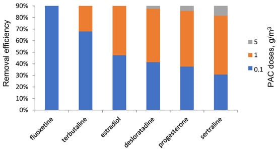 In the middle group (10–100 ng/L) consisting of six pharmaceuticals, the amount of PAC required in order to reduce them by 90% is presented in Figure 2. It is shown that only fluoxetine will be reduced to the target level by the lowest dose of 0.1 g/m3. Increasing the amount of PAC to 1 g/m3 will cause terbutaline to be reduced to the target level, while by applying 5 g/m3, all pharmaceuticals in this group will be reduced to at least 90%.
