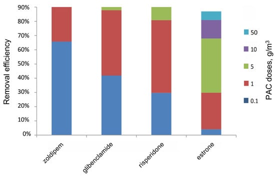 Among the 19 pharmaceuticals, which have been measured in Swedish wastewater effluents, 4 of them were found in the range of 1–10 ng/L. Consequently, no further treatment would be needed. However, there are other studies published where the concentrations of these pharmaceuticals in wastewater effluents are higher. The concentration for the individual pharmaceuticals varied between 3–78, 1–43, 3–86 and 1–43 ng/L for estrone, glibenclamide, risperidon and zoldipem, respectively (e.g., [,]). In comparison with the concentrations observed worldwide, the concentrations observed in Swedish wastewater effluents are in the lower end of the scale. When present in the upper end of the scale, a 90% reduction would be required in order to reach the target level. The required dose of PAC needed when applying concentrations observed outside Sweden for these four pharmaceuticals are presented in Figure 3.
