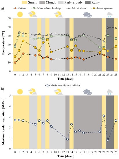 During the first 14 days, weather was sunny or slightly cloudy, whereas during the remaining part of the experiment, it changed to mostly cloudy with rainfall events occurring on days 23 and 24. The maximum daily incident solar radiation was influenced by the weather conditions (Figure 2b). Higher values were observed during sunny days, while lower ones in correspondence of cloudy or rainy weather. Overall, the average value of the daily incident solar radiation ranged between 1 and 3 MJ/m2. The sum of the solar radiation falling on the surface of the sludge during the experiment was about 22.5 MJ/m2, corresponding to 6.25 kWh/m2.