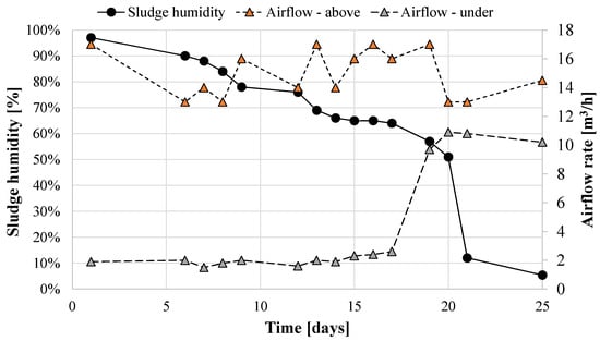 The effect of different airflow rates supplied under the sludge layer on the sludge drying process was evaluated in this experiment. Figure 3 shows the trend of the residual humidity in relationship with the airflow rate blown below and above the sludge layer.
