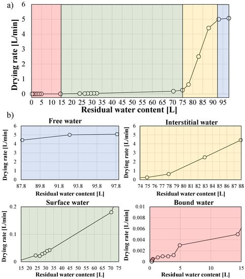 Figure 4. Sludge drying curve (a); detailed view of the several phases during sludge drying process (b).