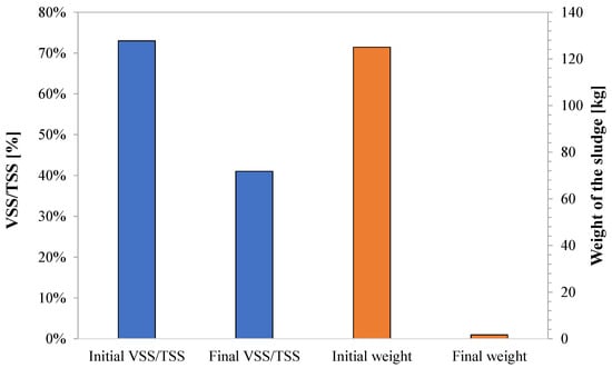 Figure 6 shows the initial and final values of VSS/TSS ratio and sludge weight. Wet sludge was characterized by an initial weight close to125 kg, whereas the fraction of volatile suspended solids was 73%.