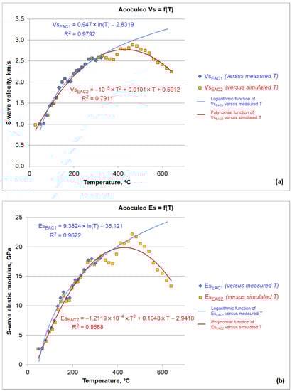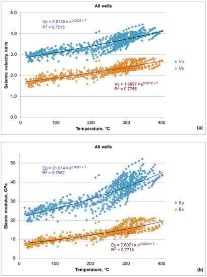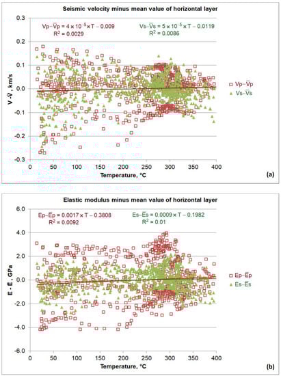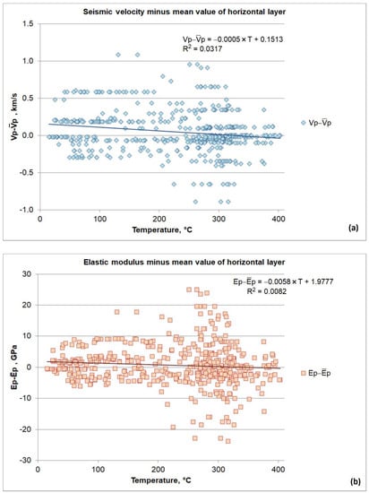 On the other hand, correlations of seismic and elastic parameters with temperature were derived by single parameter linear regression analysis in the vertical direction with R2 > 0.95, which were exponential in Los Humeros superhot and logarithmic in Acoculco EGS. However, no such correlation was observed in the horizontal direction. In addition, although the theoretical models of seismic velocities and elastic moduli discussed in the introduction correspond to descending with temperature functions, the correlations observed by analyzing measured data presented in Figure 1, Figure 2, Figure 3, Figure 4 and Figure 5 and Figure 7 correspond to ascending with temperature functions.