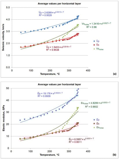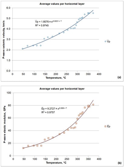 Kristinsdóttir et al. [], experimenting with samples from smectite and chlorite alteration zones of Krafla and Hengill geothermal fields in Iceland, found a clear and consistent reduction in p-wave velocity with temperature when the temperature T varied from 35 to 225 °C. Similar results obtained during experiments in two of the above rock samples are reported by Jaya et al. [], who showed a clear and consistent reduction in p-wave seismic velocities with rising temperature in the range of 25–250 °C.