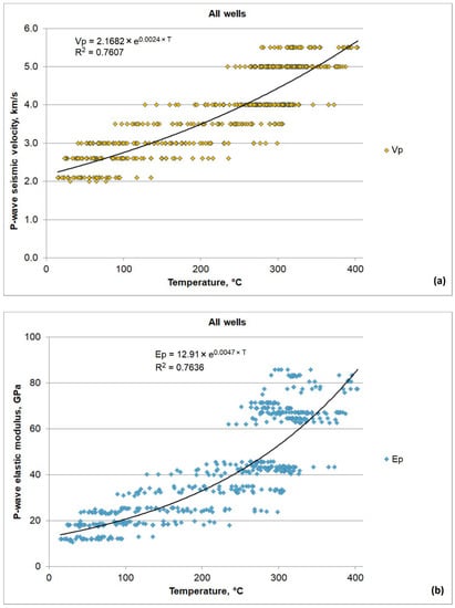 Iovenitti et al. [], using modeled p-wave seismic velocity data (VP) and temperatures measured within geothermal wells in the Dixie Valley in Nevada, found a weak statistical linear relationship between VP and T with R2 = 0.51, where R2 is the R-squared statistical measure. When surface data and data from outer wells were removed, where VP data were considered of limited reliability, a second-order polynomial relationship was evident with R2 = 0.72. Multiple-regression and residual analysis performed indicated a common relationship of VP versus T to depth with R2 of ~0.9. Similar results are reported in Iovenitti et al. [], where an empirical relation of VP versus T measured in wells was evident with R2 = 0.621, attributed to common dependence on vertical stress (and hence to depth). Vertical stress appears as a key parameter correlated to temperature.