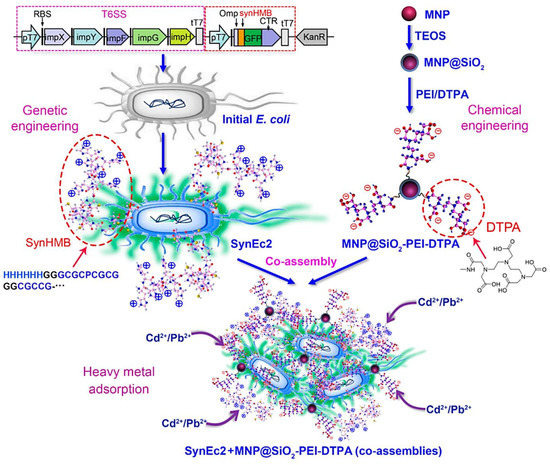 In another approach, magnetic NPs were combined with metal binding proteins to improve the removal Pb and Cd from solutions. E. coli cells were engineered to express metallothioneins on the surface of cells. These cell surface structures also comprised histidine tags, which enabled the cells to form a complex with chemically modified magnetic NPs. The cells and magnetic NPs would precipitate for easy isolation and removal of the metal bound cells. Genetically engineered E. coli cells were obtained via the introduction of a de novo synthetic HM-capturing gene to encode a protein SynHMB consisting of a six-histidine tag, two cysteine-rich peptides, and a metallothionein arrangement in addition to the synthetic type VI secretory system (T6SS) cluster of Pseudomonas putida, providing the synthetic cells (SynEc2) with significant capability of showing the HM-capturing SynHMB on their cell surfaces (Figure 1) [67]. The synthetic bacterial cells and magnetic NPs were co-accumulated to produce biotic/abiotic complexes showing self-evolving characteristics, because of the surface exposure of six-histidine tag on the synthetic bacteria and carboxylic functionalities on magnetic NPs@SiO2-polyethylenimine-diethylenetriaminepentaacetic acid. Consequently, the prepared complexes could remove Cd2+ and Pb2+ with high removal efficiency (>90%) and recyclability by artificial magnetic fields [67].