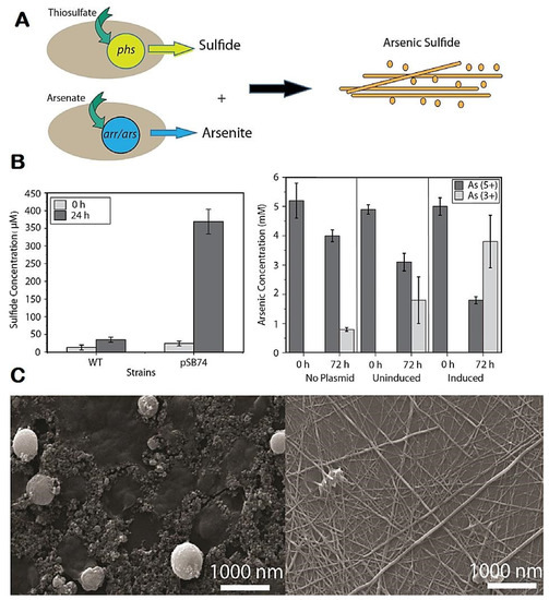 (A,B) Genetically modified E. coli strains applied for the bioreduction of thiosulfate into sulfide in addition to the arsenate into arsenite to synthesize arsenic sulfide chalcogenide nanomaterials (C). Adapted from Ref. [78] with permission. Copyright 2018 John Wiley & Sons Ltd. (CC BY 4.0).