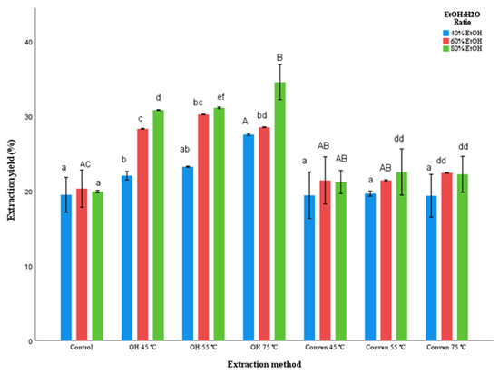 Figure 3. Extraction yield (g extract/100 g dry olive leaves) obtained through various extraction methods. The Control represents the extraction with no heat treatment (25 °C). The OH represents ohmic extraction using different concentrations of aqueous ethanol (40%, 60%, and 80% EtOH v/v) and different temperatures (45 °C, 55 °C, and 75 °C), The Conven represents groups of samples with conventional heating extraction using the same solvent ratios/temperatures as those employed for OH samples. Mean values of % yield are shown with standard deviation error bars for each category of extraction method. Different letters (a–f, A–C) above the bars indicate statistically significant differences between means (p < 0.05).