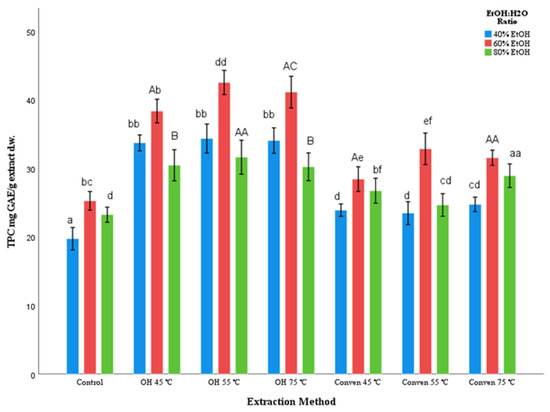 Figure 4. Total phenolic content (TPC) mg GAE/g extract d.w. through various extraction methods are presented with standard deviation bars. The Control represents the extraction with no heat treatment (25 °C). The OH represents ohmic extraction using different concentrations of aqueous ethanol (40%, 60%, and 80% EtOH v/v) and different temperatures (45 °C, 55 °C, and 75 °C). The Conven represents groups of samples with conventional heating using the same solvent ratios/temperatures as those applied for ohmic system. Different letters (a–f, A–C) above the bars indicate statistically significant differences between means (p < 0.05).