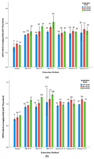 Figure 5. Mean values of Trolox equivalent antioxidant capacity (TEAC) in olive leaf extracts. (a) ABTS radical scavenging activity (mM TE/g extract d.w.). (b) DPPH radical scavenging activity (mM TE/g extract d.w.). Different letters (a–f, A–C) above the bars indicate statistically significant differences between means (p < 0.05). The Control represents the extraction with no heat treatment (25 °C). The OH represents ohmic extraction using different ratios of aqueous ethanol (40%, 60%, and 80% EtOH v/v) and different temperatures (45 °C, 55 °C, and 75 °C), The Conven represents groups of samples with conventional heating using the same solvent ratios/temperatures as those in OH method.