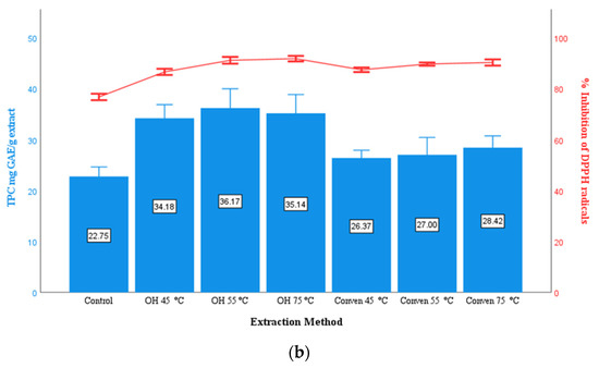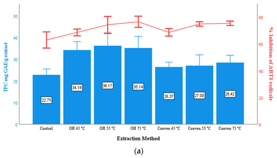 To present more informative data, the results were further evaluated to compare the % inhibition of free radicals with the mean values of TPC for each extraction group (Figure 6). Regardless of solvent ratios, comparatively, similar trends were seen in the results of TPC and antioxidant activity (both methods). However, the highest mean values in TPC were observed in OH 55 °C, while the highest values of antiradical activity in both assays belonged to OH 75 °C. In addition, the magnitude of mean differences of TPC between OH groups and Conven groups was much greater compared to the corresponding groups in ABTS and DPPH.