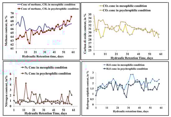 Biogas composition was analyzed by a gas chromatograph (GC) and is illustrated in Figure 5. The results showed that methane and carbon dioxide varied from 62.33% to 69.16% and 34.58% to 28.55%, respectively, under psychrophilic temperature conditions, while in mesophilic temperature conditions, methane and carbon dioxide content was recorded in the range of 69.15 to 65.21% and 32.21% to 28.55%, respectively. The average methane, carbon dioxide, nitrogen, and hydrogen sulfide content over 60 days retention period were 65.53%, 31.40%, 1.66%, and 1.36%, respectively, in psychrophilic temperature conditions and 66.60%, 30.58%, 2.01%, and 0.9356% in mesophilic temperature conditions. In both psychrophilic and mesophilic temperature conditions, the methane content in the biogas from 50% JDC + 50% CD was significantly higher than the biogas from cattle dung. This is because of the presence of more lipid and protein content which, under anaerobic digestion, results in more methane content released into the atmosphere (70–84%) [33,34].