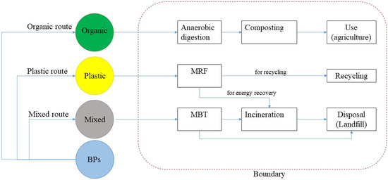 Figure 2 shows the waste-management-system mass streams for organic, plastic and mixed routes for BPW treatments. In Table 2, the mass and energy flows involved are summarized.