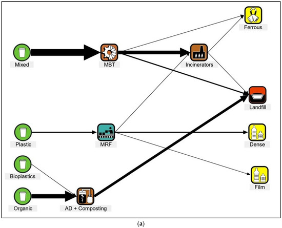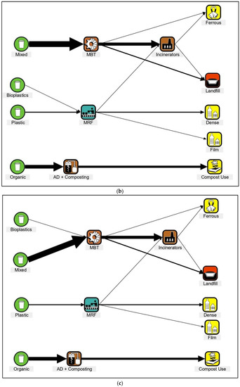 Mass inventory of organic (a), plastic (b) and mixed (c) waste treatment routes.