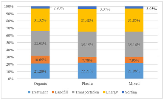 Finally, all the scenarios achieved a positive cost, revealing how the expenses calculated exceeded the revenues. It is important to note that revenues from the tariff paid by users of the waste management system were not considered, as this assessment focused only on treatment. The BPW treatment cost revealed how the highest cost was achieved by the organic scenario (120.35 EUR), followed by the plastic (112.21 EUR) and mixed one (109.43 EUR).