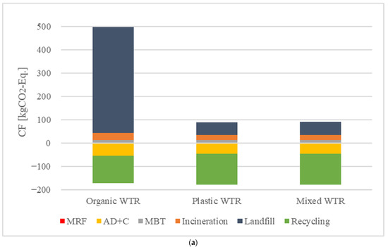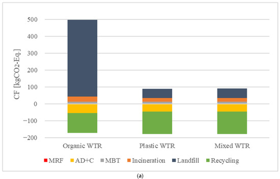 The organic waste treatment route achieved the highest CF (324.64 kgCO2-Eq.) among the three scenarios, followed by mixed and plastic waste treatment routes (−87.16 and −89.17 kgCO2-Eq. respectively). The first main finding is that only two scenarios (plastic and mixed) showed a negative value, revealing how these systems generated an environmental benefit. Instead, the organic one achieved a positive CF, which signifies an environmental burden on the system. Indeed, a negative CF value means an environmental benefit/credit, whereas a positive value indicates an environmental burden [41]. With this concept, it is easy to note that the environmental credit in every scenario has been given from the combined anaerobic digestion and composting process and from the recycling of waste (plastics, compost, etc.). In fact, energy production during anaerobic digestion and the reuse of materials instead of virgin ones have reduced the GHG emissions in the systems. On the other hand, MRF, MBT, incineration and, especially, landfilling achieved a positive CF value. MRF and MBT are processes that require energy and generate GHG. In each of them, the introduction of BPW in plastic and mixed waste, respectively, (slightly) increased the CF values of about 0.3 kgCO2-Eq. Actually, the MRF in the waste management system had a negligible effect from an environmental point of view, since the contribution in the CF calculation was lower than 1%. Furthermore, incineration resulted in a positive value: the highest impact was the one obtained in the organic waste treatment route, wherein the energy production was the lowest. Indeed, despite incineration allowing the recovery of energy, it is known that this process is a source of GHG in the form of CO2, CO and N2O [42]. Finally, the highest environmental burden was achieved in every scenario by landfilling. In the plastic and mixed waste treatment routes, the CF value was 54.3 and 56 kgCO2-Eq., and the value was almost 10 times higher (454 kgCO2-Eq.) in the organic route. Indeed, the highest amount of waste landfilled, composed mainly of organic materials in the form of compost, increased the GHG emission produced during this stage. The degradation of compost in a semi-aerobic environment of landfill also generated CH4, with a GWP 21–23 times higher than CO2 [43]. This amount was not recovered by the plant and increased the CF value, resulting in 67.78% of the total CF value (Figure 4b).
