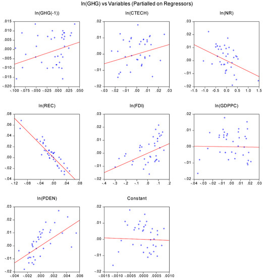 Figure 1 illustrates the variables’ leverage plots and demonstrates that, about GHG emissions, the regressors are widely spread around the actual relationship, indicating potential outliers in the given model. As a result, it is necessary to determine the number of outliers present in a particular model that must be handled using complex statistical approaches throughout the regression process.