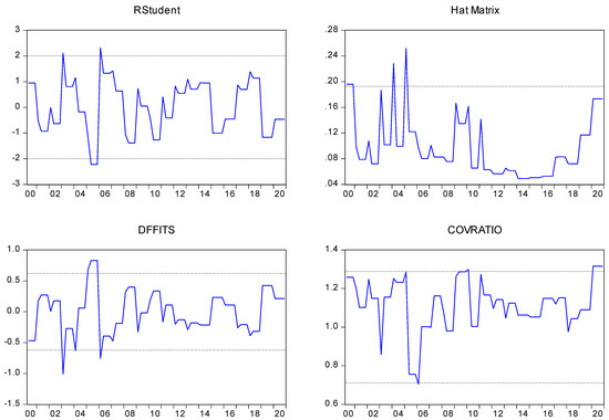 Figure 2 illustrates four distinct influence statistics for detecting the existence of outliers in a given model. Three outliers in 2003Q1, 2006Q1, and 2005Q3 were validated using Rstudent statistics. Two outliers are shown in the Hat Matrix for 2004Q1 and 2005Q1. DFFITS identifies three outliers in 2005Q2, 2003Q1, and 2006Q1, whereas COVRATIO identifies a single outlier in 2010Q1.