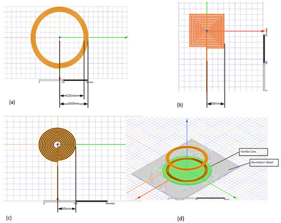 Simulation designs of transmitter and receiver coils: (a) 120 mm diameter spiral coil geometry. (b) 120 mm diameter square coil geometry. (c) 300 mm diameter spiral coil geometry. (d) Setup including aluminum and ferrite coil.