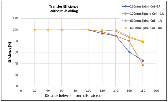 Figure 6 and Figure 7 illustrate that the highest point of power transmission exists at one frequency point, with the efficiency dropping drastically across other frequencies. The 120 mm spiral coil exhibited the highest power transmission efficiency at 0.41 MHz, and the 120 mm square coil showed the highest power transmission efficiency at 0.35 MHz. The 600 mm spiral coil exhibited the highest power transmission at 88 kHz. The high efficiency at these frequencies supports the resonance frequency theory. The circuit operates at resonance at the above-stated frequencies, enabling high power transmission efficiency.