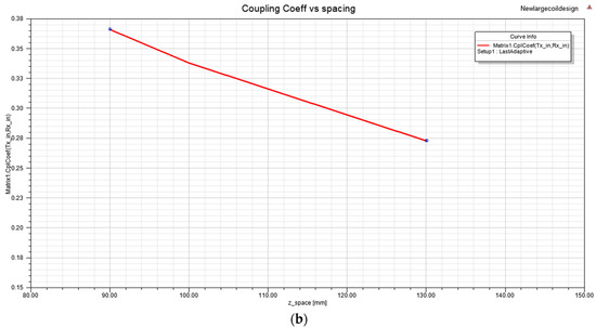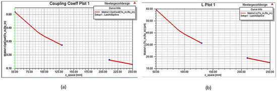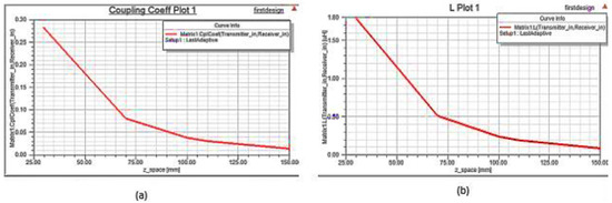 The coupling coefficient of standard WPT systems is between 0 and 1, with 1 being perfect coupling. Therefore, the coupling coefficient value is achieved from testing the coil design on ANSYS Maxwell. The resonant frequency can be calculated using Equation (5). At this frequency, the reactance of the inductor is equal to the capacitive reactance [4].