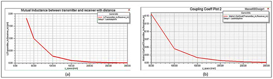 Results for 600 mm spiral coil: (a) mutual inductance vs. air gap spacing (mm), (b) coupling coefficient vs. air gap spacing (mm).