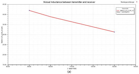 Figure 7, Figure 8, Figure 9 and Figure 10 present the results of the equivalent circuit illustrating the behavior of the coupling 230 coefficient and mutual inductance. The 120 mm spiral coil and square coil show lower values of mutual inductance compared to the 600 mm spiral coil. This can be explained due to the current flowing through the coils’ geometry and how it induces a magnetic field across the coils. However, Table 3 presents the results of each coil design for those values derived under the same circumstances and parameters using the Simplorer circuit in Figure 4.