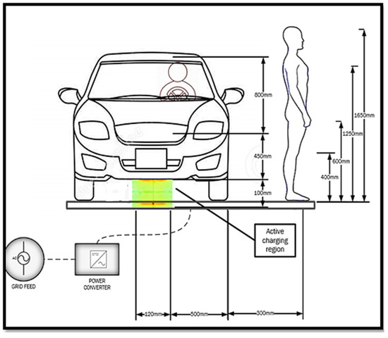 The exposure standards provide a safe range to protect vulnerable individuals. A technique to help mitigate the leakage flux in WPT systems includes using a metallic plate between humans and the coil; however, this method can cause a reduction in the inductance of coils, thereby reducing the WPT efficiency [14]. Recent contributions regarding sustainable e-mobility transportation for integrated solar roads with wireless charging techniques are proposed [15]. However, new innovative ideas related to the smart wireless electric vehicle charging system and load management utilizing fine-grained solar power predictions constrained on human electromagnetic exposure are presented [16], albeit without the deep analysis and design introduced in this paper. Additionally, a novel complete wireless charging EV system for modeling, design, and control techniques are illustrated [17] as a preliminary step toward this paper. Moreover, an experimental magnetic induction wireless power transfer for electric vehicles on solar roads is designed and implemented as another step regarding this proposed technique [18].