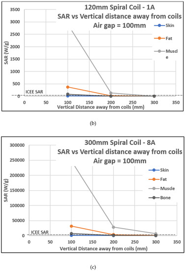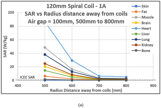 At the air gap of 100 mm, the magnetic flux density falls lower than ICNIRP 1998′s threshold of 6.27 µT at a radial distance of 400 mm away from the coils. Therefore, a safe distance is about 500 mm away from the coils. Shielding techniques were applied to the coil design to mitigate leakage flux and improve efficiency. Aluminum sheets and ferrite core materials were used on the coil geometries to analyze shielding effects. With shielding, the safe distance improved by more than 200 mm. For the 120 mm spiral coil, the 120 mm square coil, and the 600 mm spiral coil operating at 1 A excitation, the SAR levels are under the threshold at 700 mm away from the coils.