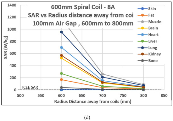 The 120 mm diameter coil is excited at 1 A, while the 600 mm diameter coil is excited at 8 A to analyze the differential range in SAR levels considering the geometry of the coil and the current passing through the coil. SAR calculations are based on the electric field values. The maximum magnetic field values did not thoroughly correlate with the maximum electric field values based on position [23]; however, there is a similarity in progression changes over a long distance. The electric field values are increased with the distance from the coils that are decreasing.
