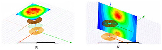 The resonant coupling wireless transfer method is utilized due to its high potential power transmission and high efficiency [19,20]. The main component responsible for wireless power transmission is electromagnetic induction, also known as EMI. The principle adopts inductive coupling. Inductive coupling refers to the induction of voltage across the end of a receiver coil when current is passed through the transmitting coil. The charging current through the transmitting coil creates a magnetic field around it via amperes law. This magnetic field, in turn, induces an electromotive force (EMF) in the receiver coil via Faraday’s law of induction. The direction of the magnetic field in relation to the electric field imposed by EMF can be figured out by the right-hand rules.