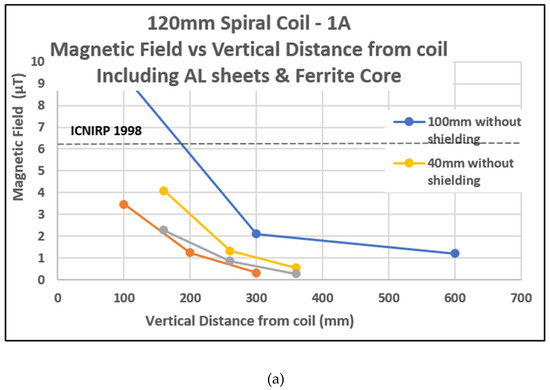 The ferrite core is a 250 mm diameter circular plate with a thickness of 2 mm. Most typical sedan vehicles have metallic parts that help mitigate leakage flux; however, the added plates help concentrate the shielding effects to the area with the highest magnetic field. Figure 3d shows the geometry design for the coils, including the shielding components. Figure 14 shows the decrease in magnetic field values and improves the safe distance by about 350 mm–400 mm. The coil geometries used to analyze the shielding are the 120 mm spiral coil and the 600 mm spiral coil because they account for the best-case and worst-case magnetic flux leakage values. The 120 mm spiral coil is excited by 1 A, and the 600 mm spiral coil is excited by 8 A. The shielding experiment is necessary to understand the effects of shielding techniques on the leakage; therefore, using these two coil geometries will suffice for this experiment.