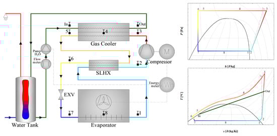 The TCO2 HPWH operates in a transcritical cycle around the critical point, as illustrated in the diagram in Figure 1. Like any heat pump, it absorbs heat from a low-temperature heat source in the subcritical region (at the evaporator; evolution from point 7 to point 1 in Figure 1). The heat is rejected at a high-temperature heat source above the critical point, in the supercritical region (at the gas cooler; evolution from point 3 to point 5 in Figure 1). Unlike conventional (subcritical) systems, no condensation occurs, it being impossible to relate the corresponding (saturation) pressure and temperature. The supercritical CO2 gas is cooled with a certain temperature glide, perfectly matching the water heating temperature profile (as depicted in the diagram, Figure 1, from “In” to “Out”). Owing to the high irreversibility losses during the expansion, TCO2 HPWHs are equipped with a suction line heat exchanger (SLHX), enhancing the cycle performance. At the SLHX, CO2 is subcooled (point 5 to point 6 in Figure 1) before being throttled to the low-pressure level (point 6 to point 7 in Figure 1). The recovered heat from the subcooling process is transferred to the low pressure and temperature side (point 1 to point 2 in Figure 1) before the compression process (evolution from point 2 to point 3 in Figure 1).