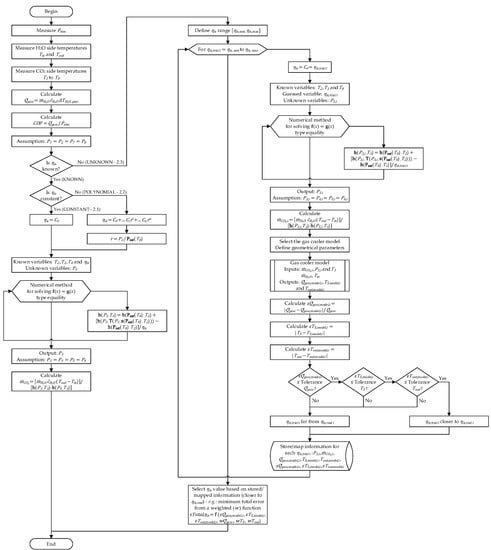 The equality of the two properties functions in Equation (18) can be solved through an iterative process, providing [Pa]. Knowing P3 value that satisfies, Equation (16), it is possible to obtain the specific enthalpy at the gas cooler inlet and outlet through Equations (5) and (7), respectively. Furthermore, it is possible to obtain the refrigerant mass flow rate from the gas cooler energy balance equation written as in Equation (8).
