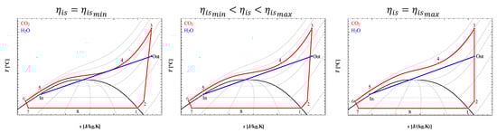 The non-measured input variables of the gas cooler model ( [Pa] and [kg·s−1]) are obtained through the process described in Section 2.1, attributing, in each iteration, a value for in Equation (17). The process will “sweep” a predefined isentropic efficiency range, providing data sets for the numerical simulation of the gas cooler model. A targeted definition of this range, decreasing the search field, can substantially improve the procedure efficiency by reducing the required computational time. As the lower limit, the compressor isentropic efficiency leading to the minimum pinch-point temperature difference between CO2 and water temperature profiles, , is proposed, as represented on the left-hand side of Figure 3. The higher limit, , can be defined, at the most, as the unattainable isentropic (ideal) compression, depicted in Figure 3 (right-hand side).