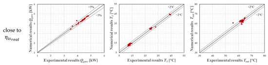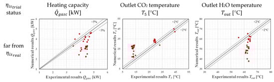 Finally, the validated gas cooler model is used to verify the physical reliability of the numerical solutions provided by the first procedure (defined in Section 2.1). As the second iteration process converges (i.e., the isentropic efficiency trial, , gets closer to the “real” value, ), the numerical results from the gas cooler model will approximate the experimental ones, as exhibited in Figure 4. While the three numerical outputs, [W], and [°C], are simultaneously within the respective and predefined acceptance tolerance, it is considered a valid . From the valid results ( close to ), it is possible to define a correlation for the isentropic efficiency with the form of Equation (19) based on the tested pressure ratios.