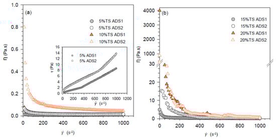 | TSs (%) | K (Pa·sn) | τy (Pa) | n | R2 | Ƞ0 (Pa·s) | Ƞꝏ (Pa·s) | (s−1) | R2 |