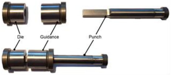 The influence of the clearance during the punching of the cable ducts made of PC/ABS was investigated using the “FlexSpee” punching unit from Stanova Stanztechnik GmbH, Berlin. The punches are generally based on ISO 8020. The die and guide bushes are generally based on ISO 8977 using a round cross-section (8 mm) as active parts of the tool (Figure 2). These were selected as an economical and yet meaningful alternative compared to the tools used in practice []. The active parts are mounted in a punching tool, which is operated by the “FlexSpee” punching unit operated by a rack and pinion drive. Punching speeds of up to 500 mm/s are possible.
