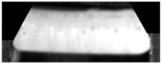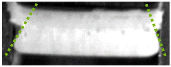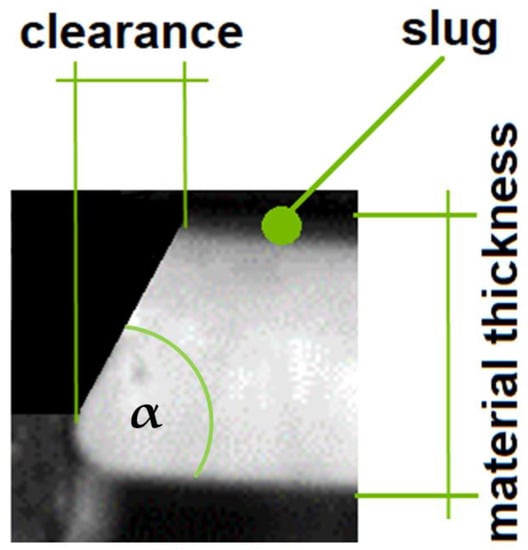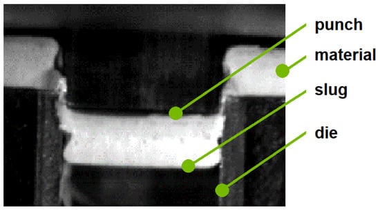 Previous research identified the clearance as the decisive factor []. In this study, larger material thicknesses were used, allowing us to evaluate fracture surfaces for the first time in depth. Due to the greater material thickness, the two cracks and their propagation were identified and explained in detail with the aid of excerpts from high-speed recordings (Figure 3, Figure 4, Figure 5 and Figure 6) []. Figure 3 shows a slug after its separation from the material. Furthermore, the punch, material, and cutting die were clearly identified from this near-cross-sectional view using tools with rectangular geometries. In the following illustrations (Figure 3, Figure 4, Figure 5 and Figure 6), the punch was arranged above the slug. The image was taken exactly when the slug was ejected downwards through the cutting die.
