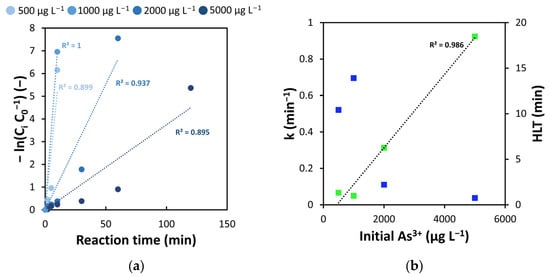 (a) Effect of initial As3+ concentration on the electrochemical oxidation of arsenic. pH = 8; conductivity = 780 µS cm−1. (b) Pseudo first-order kinetic constants k (blue) and HLT (green) as a function of initial As3+ concentration.
