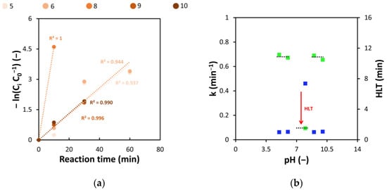 These results were also confirmed looking at pseudo first-order kinetic constants. In the case of pH equal to 8, k assumed the value of 0.461 min−1, more than seven times higher than in other tested conditions (0.064 ± 0.001 min−1) (Figure 3b). Slightly alkaline conditions (pH = 8) also reduced the HLT from 10.85 ± 0.25 (as in other alkaline and acidic tested conditions) to 1.51 min.