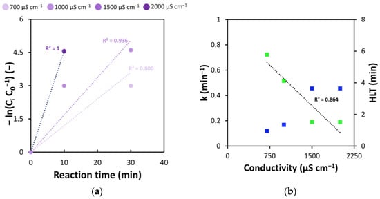 (a) Effect of initial conductivity on the electrochemical oxidation of arsenic. Initial As3+ = 1000 µg L−1; pH = 8. (b) Pseudo first-order kinetic constants k (blue) and HLT (green) as a function of initial conductivity.