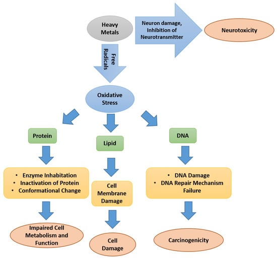 Heavy metals, which are extremely soluble in water and non-degradable, occur as free ions or are bound in chemical compounds in surface and groundwater. Dissolved heavy metals can interfere with microbial processes and impair aquatic life []. Organisms consume heavy metals and incorporate them into the food chain, where they accumulate and impose detrimental effects on health. Short overexposure and chronic exposure to heavy metals can impair vital organs and neurological systems and kill the organism []. Typically, arsenic (As), cadmium (Cd), chromium (Cr), and nickel (Ni) are carcinogenic. They cause the mutation, deletion, or oxidative damage of deoxyribonucleic acid (DNA) []. Figure 1 depicts a simple schematic of the consequences of exposure to heavy metals.