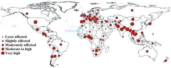 Among the heavy metals, As is toxic and carcinogenic; thus, its inhalation and ingestion pose a cancer risk. Arsenic poses maximum adverse effects on human health through As-contaminated drinking water and the environment since As is a significant groundwater pollutant []. The World Health Organization (WHO) set the maximum allowable level of arsenic in drinking water at 10 ppb. Arsenic contamination in groundwater affects roughly 108 countries, with concentrations exceeding 10 ppb. About 32 countries in Asia, 31 in Europe, 20 in Africa, and 20 in North and South America suffer from As pollution. Arsenic poisoning threatens more than 230 million people worldwide []. Figure 2 shows the global extent of As contamination. Due to the poor water quality in rural areas, people living in small, rural, and remote communities suffer from health problems and diseases caused by dangerous pollutants such as As []. Even at low concentrations, exposure to As increases the risk of cardiovascular disease and stroke [,,]. In addition, As exposure can cause hypertension [], and As in drinking water can also cause liver damage and skin cancer [,].