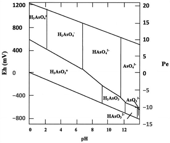 Eh−H diagram for aqueous arsenic species at 25 °C. (reprinted from [] with Elsevier permission).
