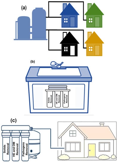 (a) Small-scale (community) water treatment system, (b) Point-of-use (POU) system, and (c) Point-of-entry (POE) system. HE: heavy metals; OM: organic matter.