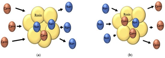 Ion exchange is a chemical reaction that removes dissolved metal ions from the solution and replaces them with other similarly charged ions []. It has been used for a long time to soften and demineralize water and eliminate nitrate and other water treatments []. Figure 6 shows the schematic of calcium ion exchange (water softening) and resin regeneration.