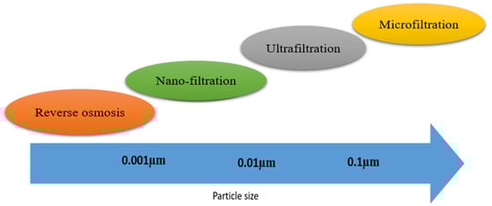 Membrane technologies are pressure-driven processes where membranes selectively allow the particles (atoms and ions) to cross them. In this case, the membrane allows water to pass through the filter and retains heavy metals. These technologies are categorized into four main groups (Figure 7): microfiltration, ultrafiltration, nanofiltration, and reverse osmosis based on particle size. Table 3 reports the results of different membranes for As removal under specific conditions. As in Table 3, the removal effectiveness depends on the type of membrane, the solute, and how those two interact. The temperature, pH, pressure, and concentration influence the rejection. The advantage of this method is that the membrane eliminates As and some dissolved minerals or even pathogenic microorganisms []. Another benefit of membrane technologies is that since membranes do not accumulate impurities, chemical usage is limited to cleaning them [].