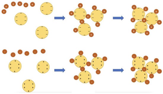 Coagulation-flocculation is another standard method for As removal from water. Although these processes are sometimes used interchangeably, they are two different processes []. In the coagulation process, a coagulant is added to destabilize the colloid particles to start aggregation by neutralizing their charges (Figure 8) and thus the electrostatic repulsive forces []. Cationic coagulants lessen the negative electric charge of the colloids by providing positive charges to destabilize the non-settleable particles. Then, gentle (slow) mixing is maintained to promote the agglomeration of the new neutral colloids into larger flocs; the slow mixing process is called flocculation []. The pH can be adjusted in these units to increase removal efficiency. The floc size, strength, and structure may be affected by pH adjustment []. Aluminum sulfate (Al2(SO4)3) and ferric chloride (FeCl3) are among the common coagulants for water treatment []. Equations 8 and 9, respectively, show the As removal reactions when iron and aluminum are used as the coagulant [].